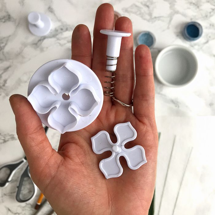 Цветок гортензии состоит из трёх или четырёх лепестков в зависимости от сорта. Трафарет для них вы можете нарисовать самостоятельно, распечатать или же воспользоваться вот таким лайфхаком. Возьмём вырубку для сахарных цветов и разберём на части. Теперь мы можем использовать её в качестве трафарета. В конструкции каждой из таких вырубок содержится пружинка, а значит её совершенно легко можно собрать в первоначальный вариант.