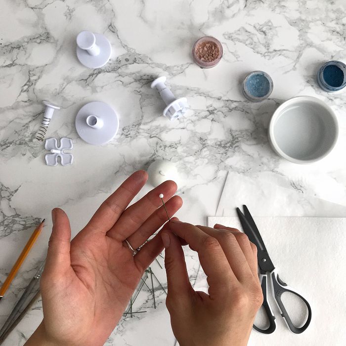 На основании каждой палочки крепим небольшую горошину из мастики. Это будет серединка будущей гортензии.