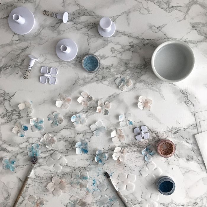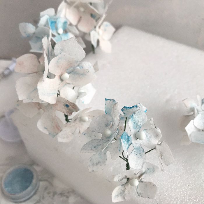 Вырезанные лепестки гортензии смачиваем небольшим количеством водки с помощью широкой кисти. Поверх проходимся сухой широкой кистью с цветочной пыльцой. Старайтесь окрашивать лепестки не в сплошной цвет, а пятнами, слегка прикасаясь кистью.