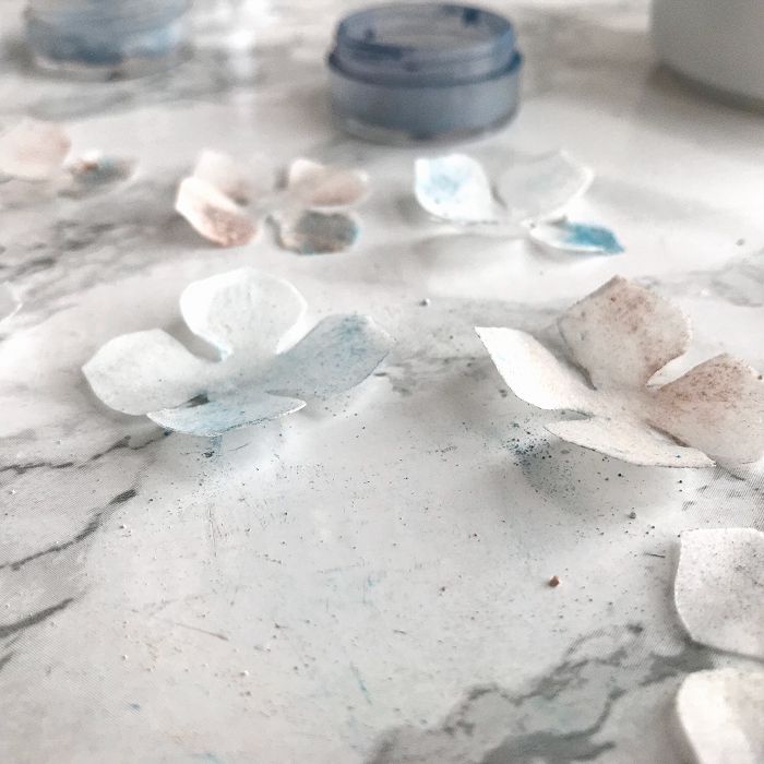 Окрашенные, но ещё не высохшие лепестки прижимаем пластиковым вайнером из разобранной вырубки для гортензии.