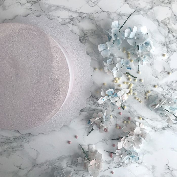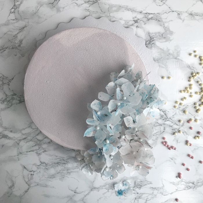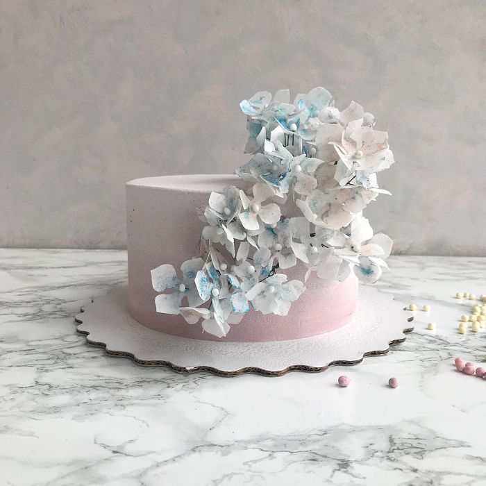 После долгих часов кропотливой и мелкой работы, наша гортензия готова украсить торт или любой другой десерт. Крепим цветы и наслаждаемся изящной и воздушной композицией.